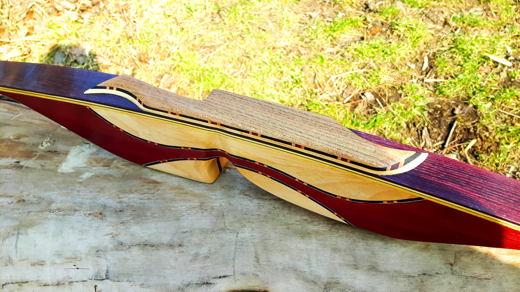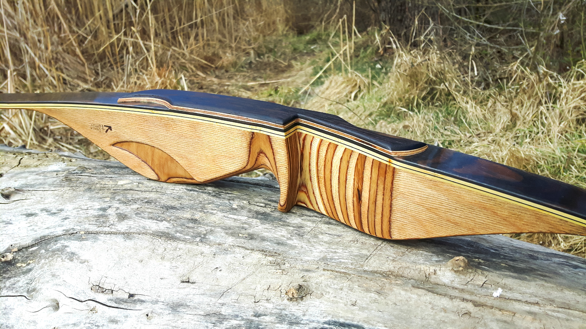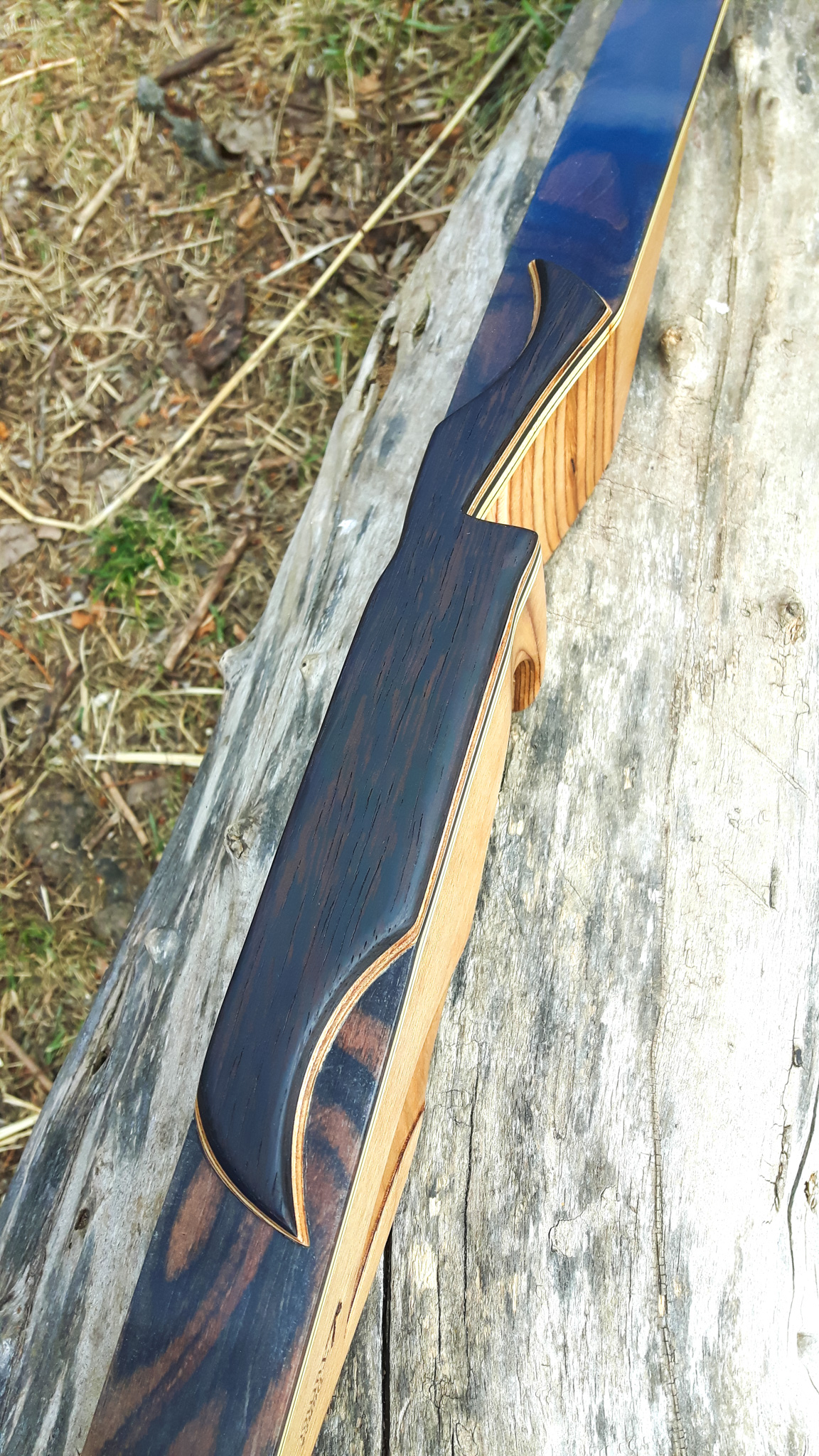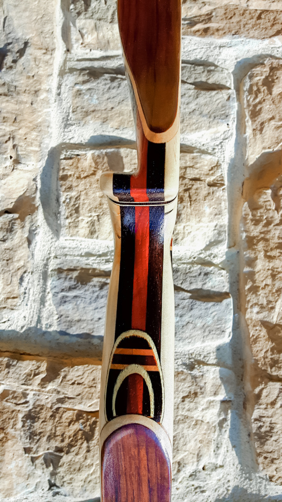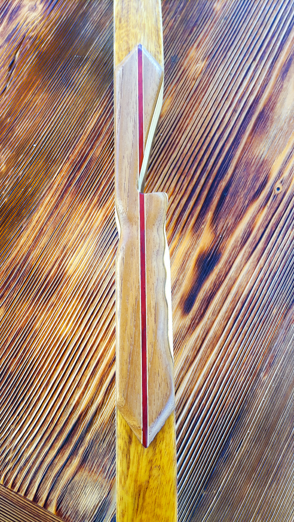 Seitdem baue ich ausschließlich Glaslaminat Langbogen. Die Griffstücke fertige ich aus ganzen Holzstücken, laminierten Holzstücken, mit oder ohne Zierfurnier oder aus Epoxy Resin an. Mehr als 20 Furniere habe ich mir für die Bauch und Rückenseite der Wurfarme angeschafft, die ich dazu passend für die Griffstücke verwende. Zur Verminderung des Handschocks baue ich in die Griffstücke Blei Kanter ein und durch das höhere Gewicht liegt der Bogen bei Wind auch ruhiger in der Hand.
