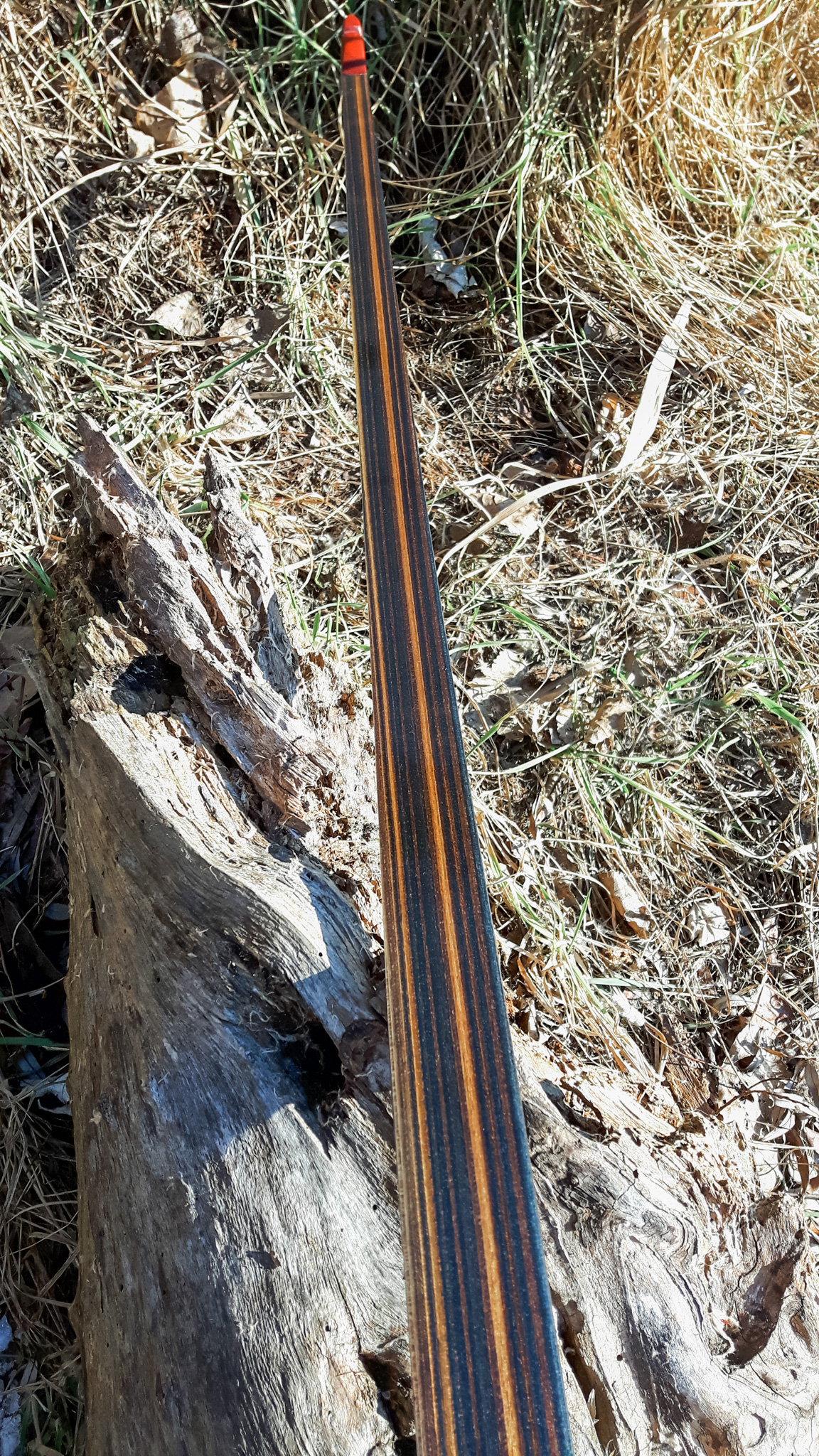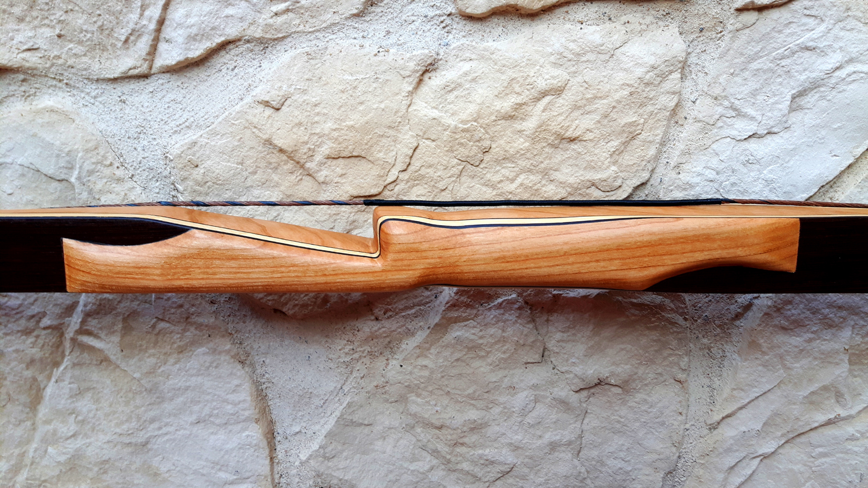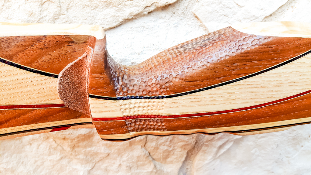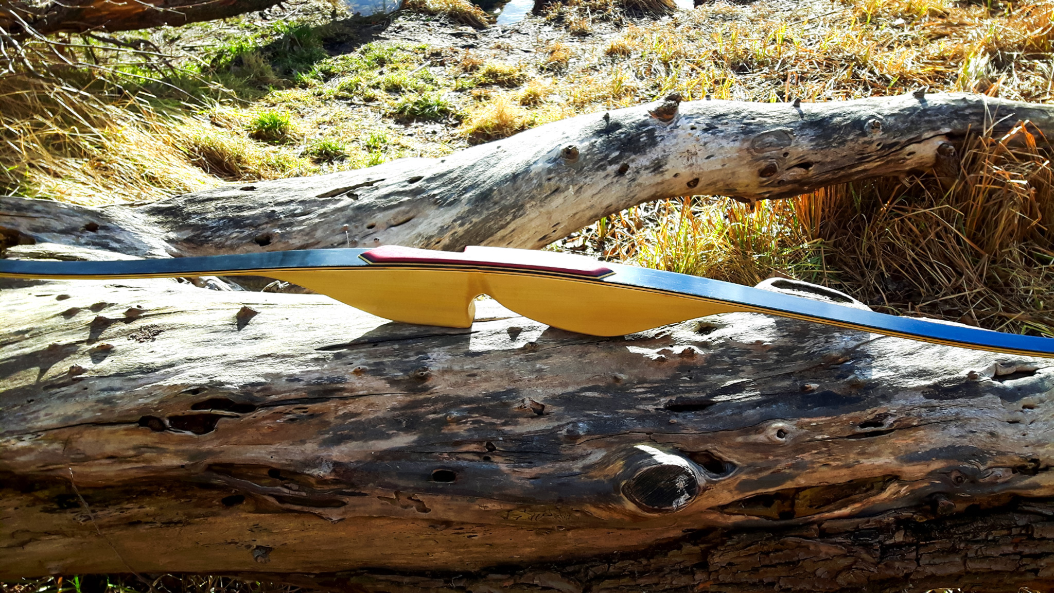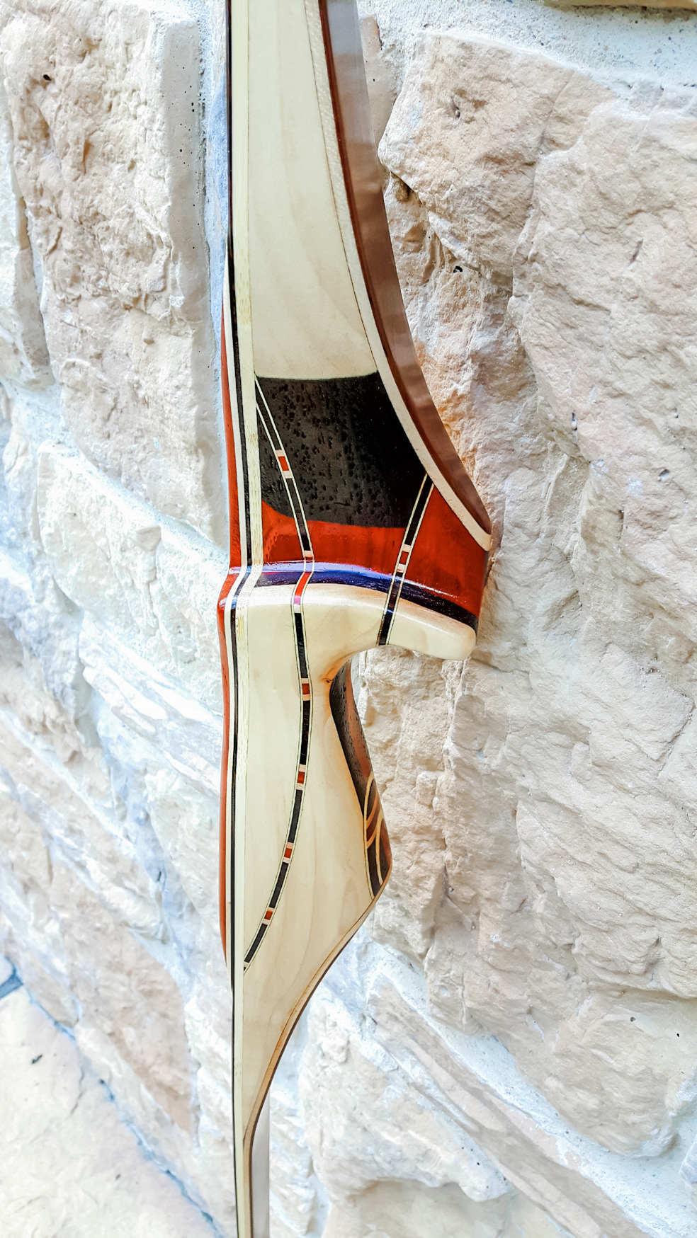 Seitdem baue ich ausschließlich Glaslaminat Langbogen. Die Griffstücke fertige ich aus ganzen Holzstücken, laminierten Holzstücken, mit oder ohne Zierfurnier oder aus Epoxy Resin an. Mehr als 20 Furniere habe ich mir für die Bauch und Rückenseite der Wurfarme angeschafft, die ich dazu passend für die Griffstücke verwende. Zur Verminderung des Handschocks baue ich in die Griffstücke Blei Kanter ein und durch das höhere Gewicht liegt der Bogen bei Wind auch ruhiger in der Hand.