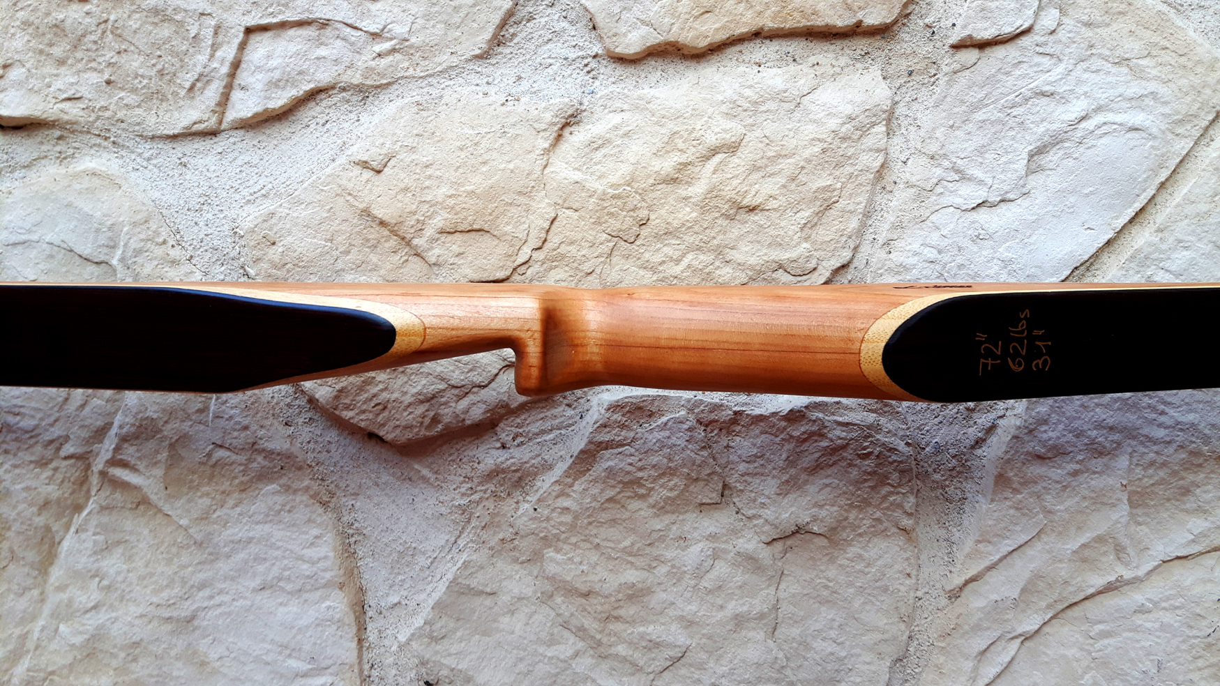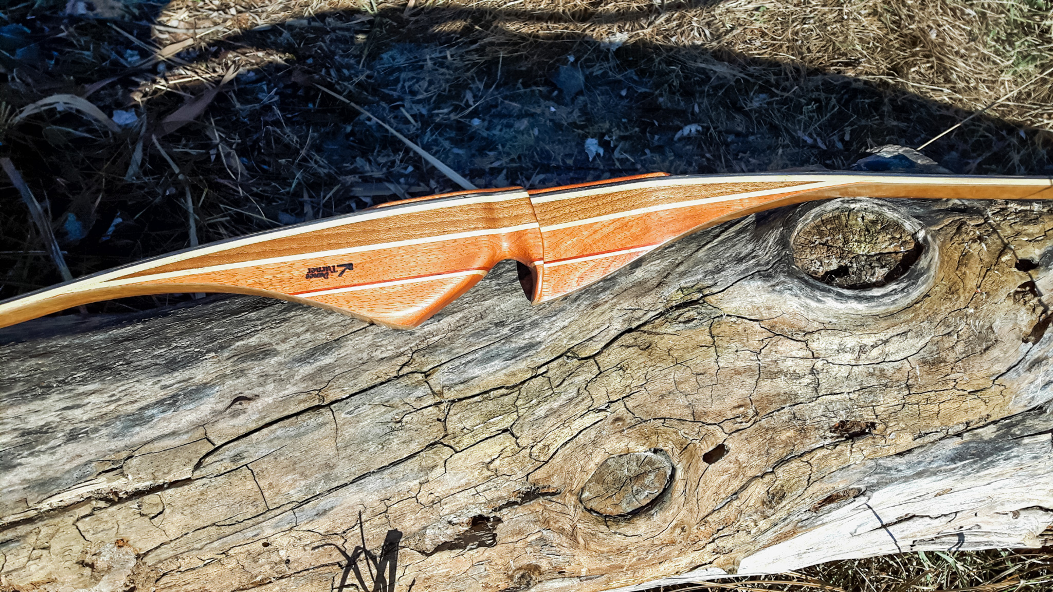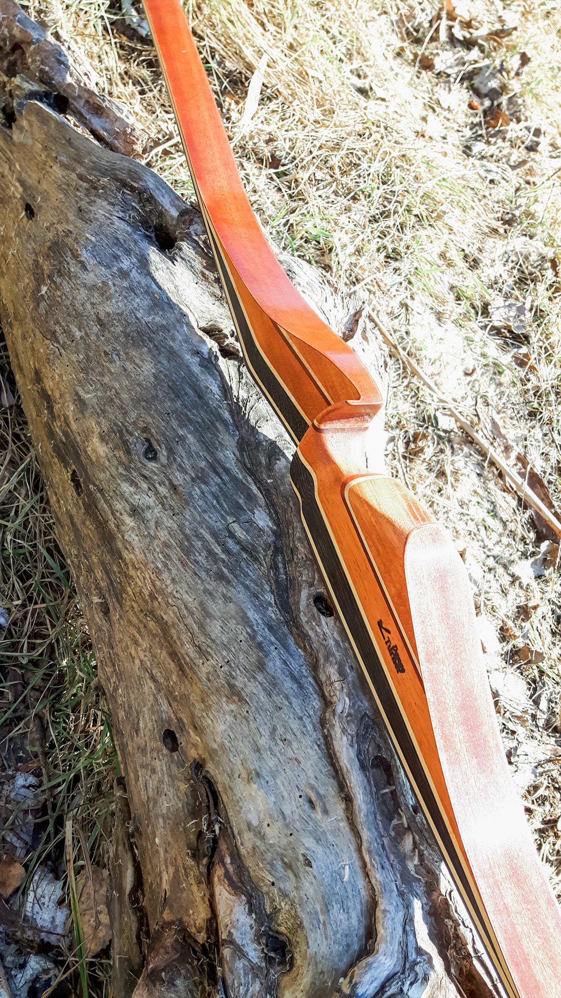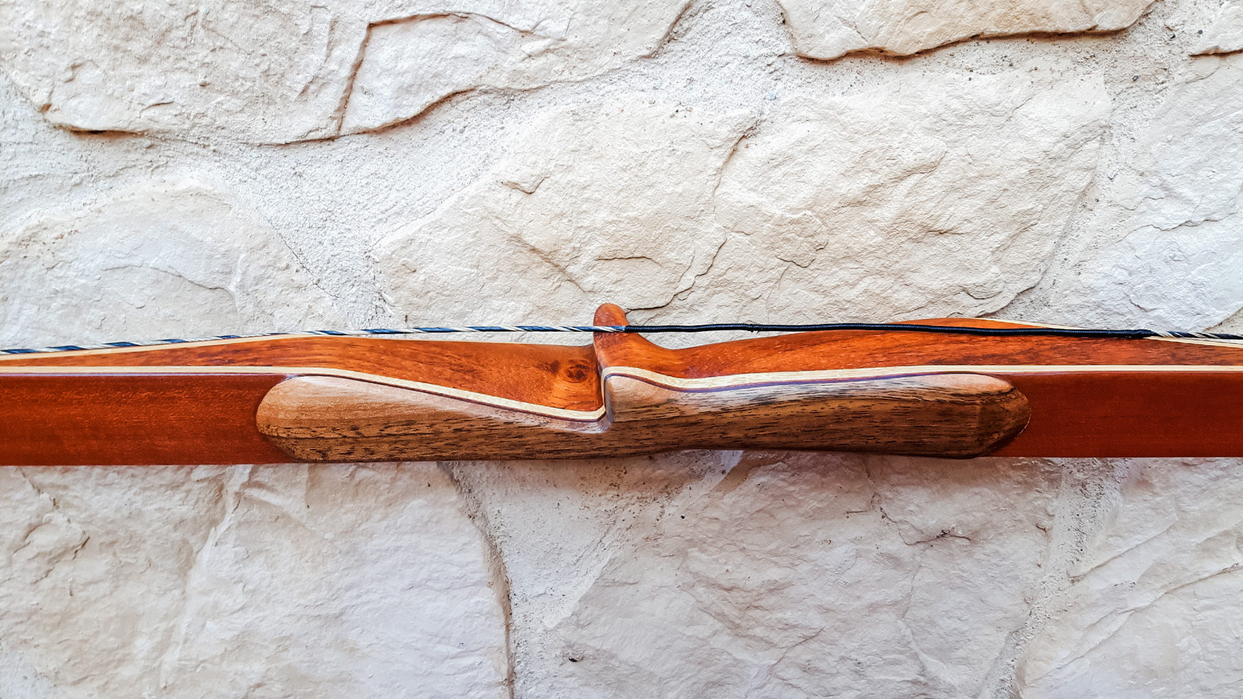 Seitdem baue ich ausschließlich Glaslaminat Langbogen. Die Griffstücke fertige ich aus ganzen Holzstücken, laminierten Holzstücken, mit oder ohne Zierfurnier oder aus Epoxy Resin an. Mehr als 20 Furniere habe ich mir für die Bauch und Rückenseite der Wurfarme angeschafft, die ich dazu passend für die Griffstücke verwende. Zur Verminderung des Handschocks baue ich in die Griffstücke Blei Kanter ein und durch das höhere Gewicht liegt der Bogen bei Wind auch ruhiger in der Hand.