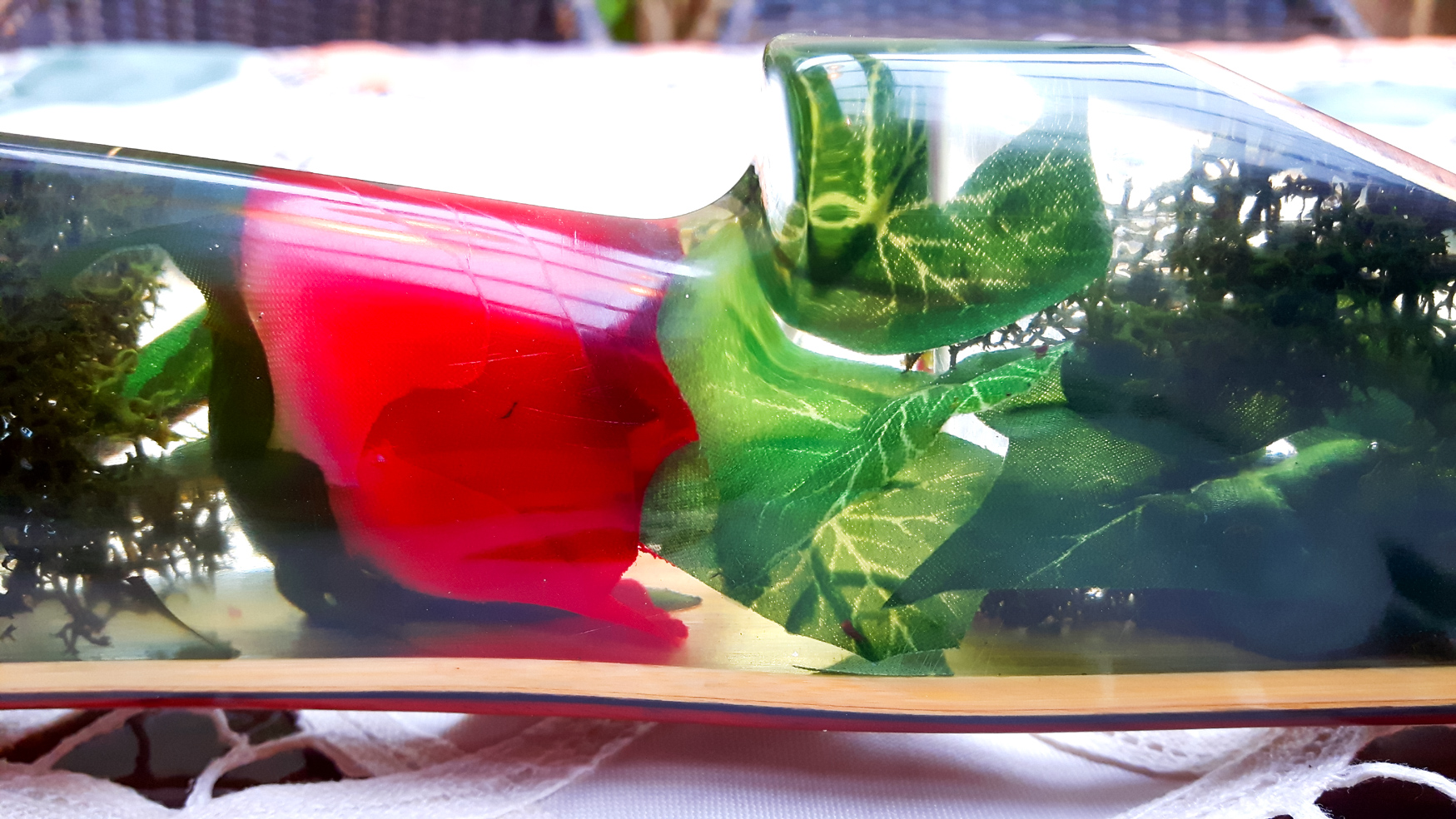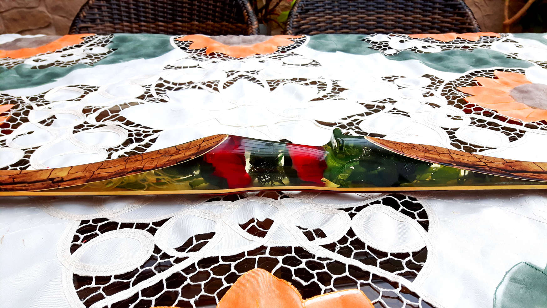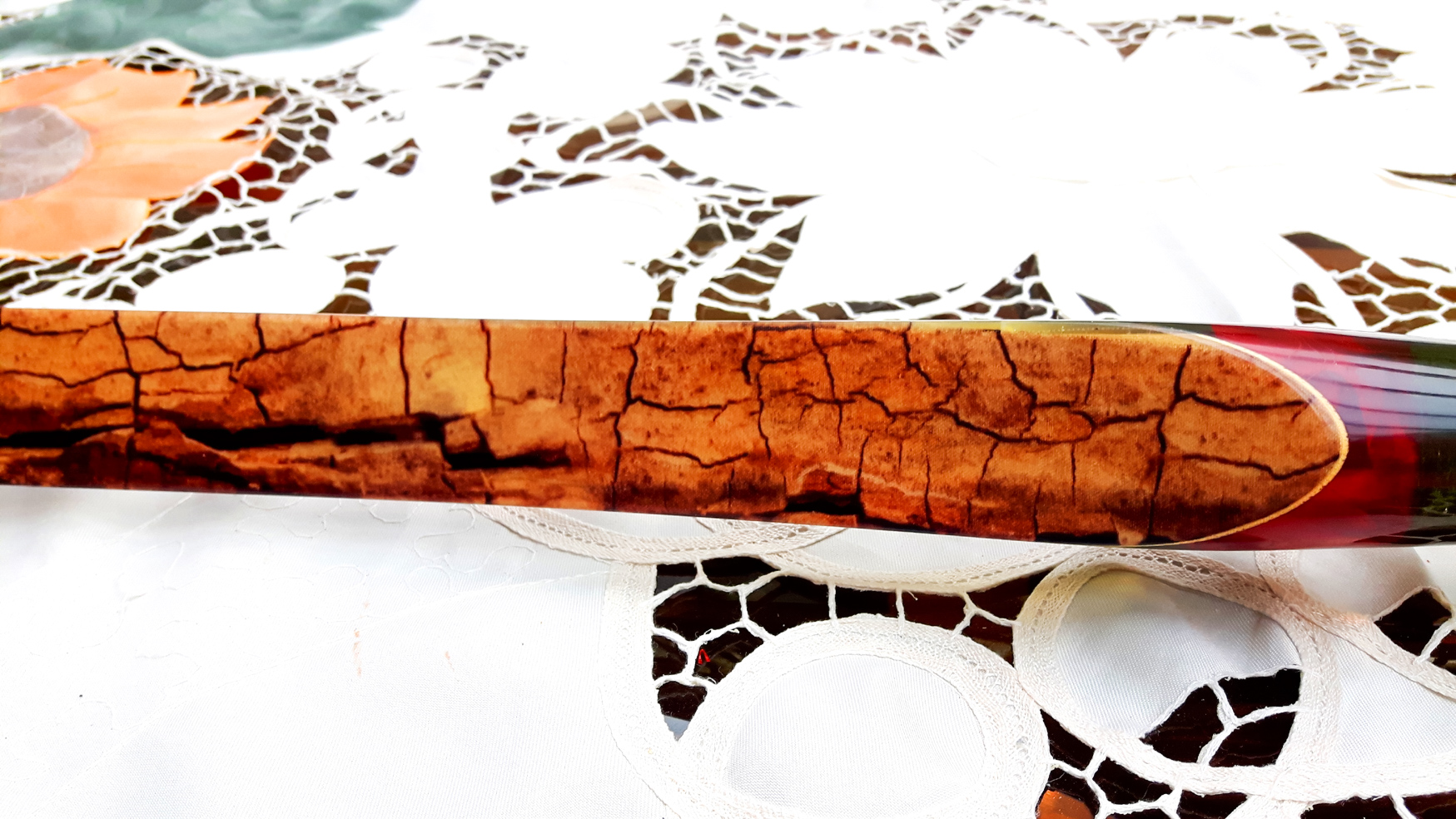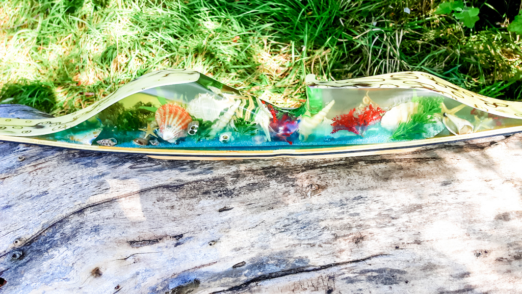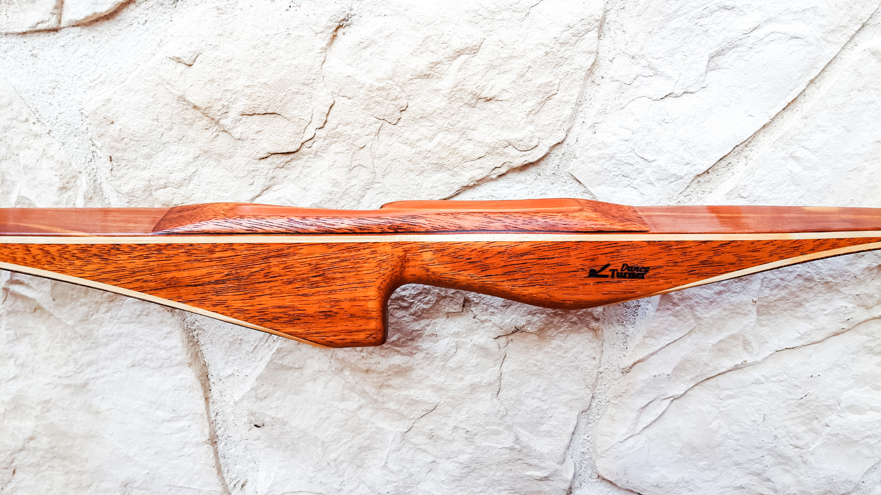 Seitdem baue ich ausschließlich Glaslaminat Langbogen. Die Griffstücke fertige ich aus ganzen Holzstücken, laminierten Holzstücken, mit oder ohne Zierfurnier oder aus Epoxy Resin an. Mehr als 20 Furniere habe ich mir für die Bauch und Rückenseite der Wurfarme angeschafft, die ich dazu passend für die Griffstücke verwende. Zur Verminderung des Handschocks baue ich in die Griffstücke Blei Kanter ein und durch das höhere Gewicht liegt der Bogen bei Wind auch ruhiger in der Hand.